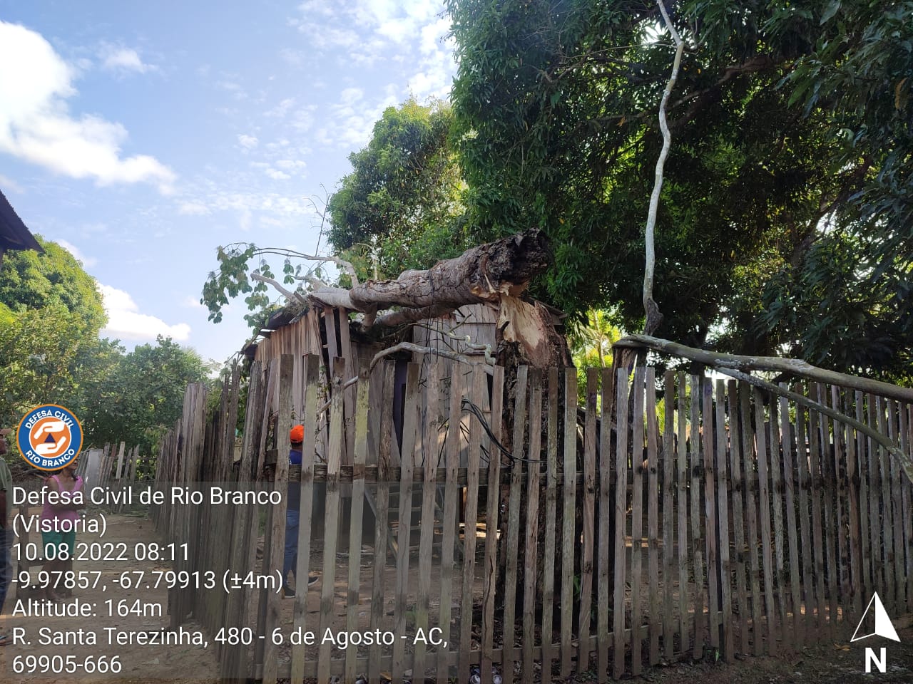 Uma árvore seringueira caiu em cima de uma casa no bairro 6 de Agosto, devido aos fortes ventos do temporal que aconteceu na capital, na última segunda-feira (8). De acordo com o coordenador da Defesa Civil de Rio Branco, o Tenente Coronel Cláudio Falcão, a ocorrência chegou à Defesa Civil no final da tarde desta terça-feira (9) e na manhã desta quarta-feira (10), a equipe fez uma vistoria acompanhada da Assistência Social do município.