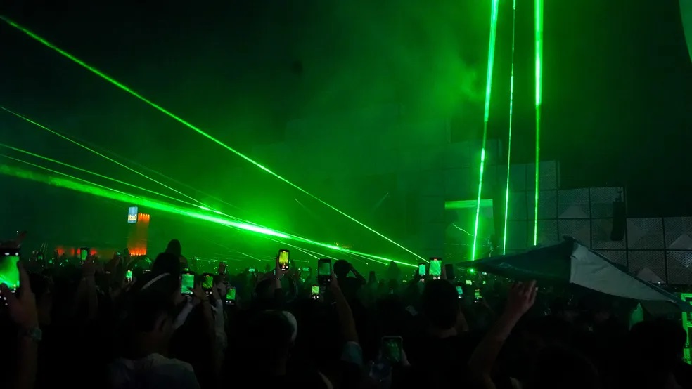 A Laser 3D Show é a empresa responsável pelo equipamento de iluminação do show de Alok no Rock in Rio. Ela explica que, para a apresentação, foram instalados no palco 28 lasers, que estavam a 10 metros de altura do público e apontados para cima.