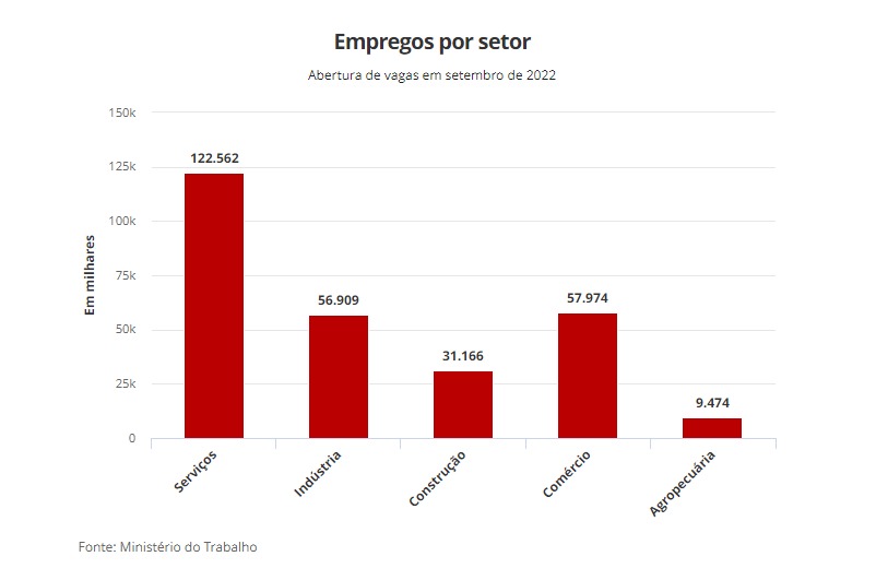 Os números do Caged de setembro de 2022 mostram que foram criados empregos formais nos cinco setores da economia.
