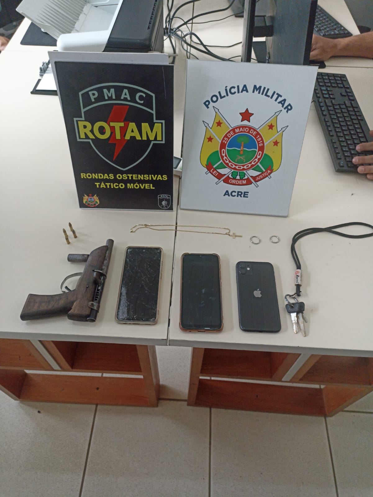 Os policiais relataram que foram abordados por uma vítima que havia sido roubada momentos antes por um casal de motociclistas armados. Com as informações e características, as guarnições localizaram os suspeitos transitando em uma motocicleta, e durante a abordagem encontraram com eles quatro celulares e uma arma de fogo artesanal, de calibre .22.