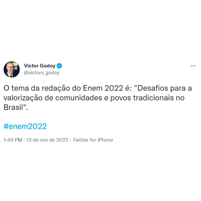 O tema da redação do Exame Nacional do Ensino Médio (Enem) 2022 é “Desafios para a valorização de comunidades e povos tradicionais no Brasil”. A informação foi divulgada pelo ministro da Educação, Victor Godoy, em uma rede social. A redação faz parte do primeiro dia de prova, realizada neste domingo (13).