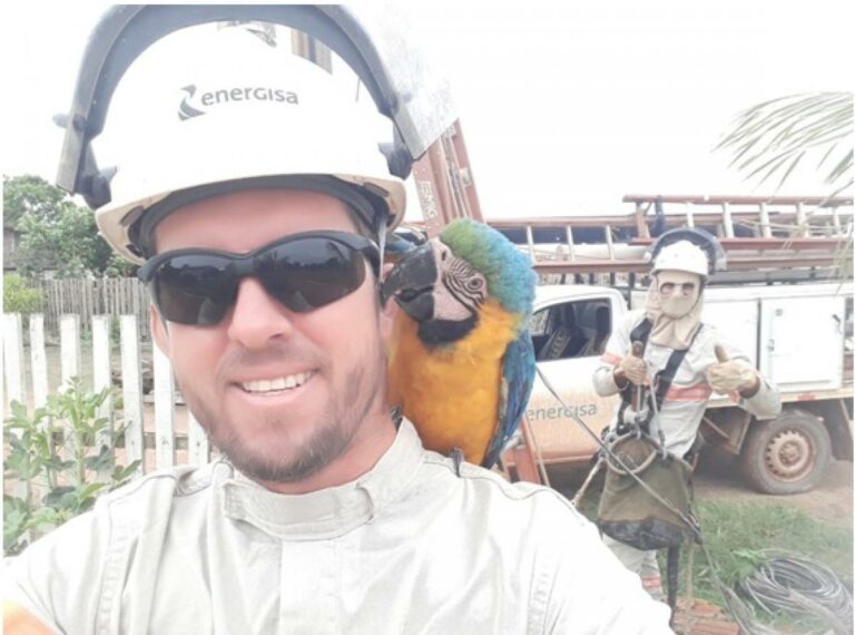 Uma arara-canindé protagonizou uma cena inusitada no distrito de Guariba, em Colniza, município do noroeste de Mato Grosso que já faz parte da área amazônica. A ave vive livre e é visita constante em casas da região e ao ver a equipe de eletricistas que trabalham na área, resolveu conferir de perto o trabalho feito.