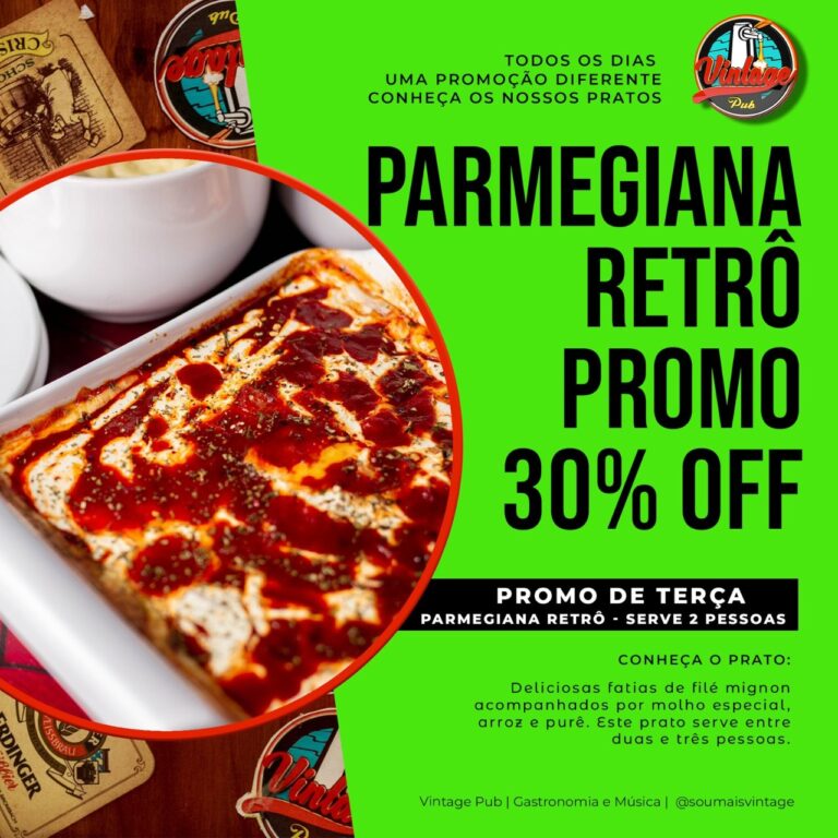 O menu dessa terça-feira (08), é o tradicional ‘Parmegiana Retrô’, uma deliciosa combinação de filé mignon ao molho especial, e a suavidade do purê que você só encontra no menu Vintage.