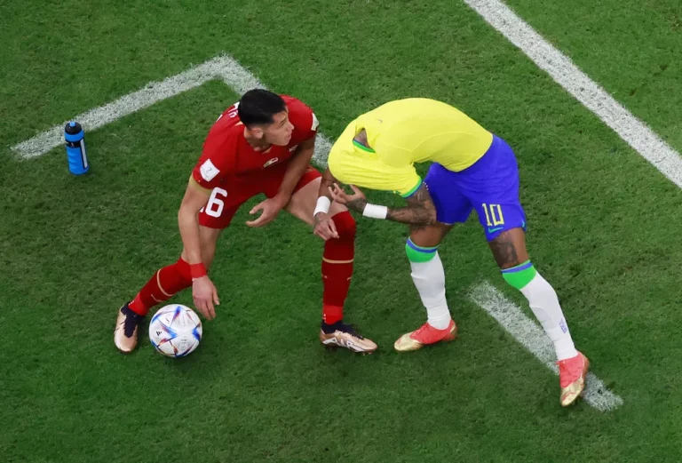 Um lance em específico, logo no início do jogo, rendeu provocação da torcida brasileira: Lukic, da Sérvia, quase arrancou a camisa de Neymar.