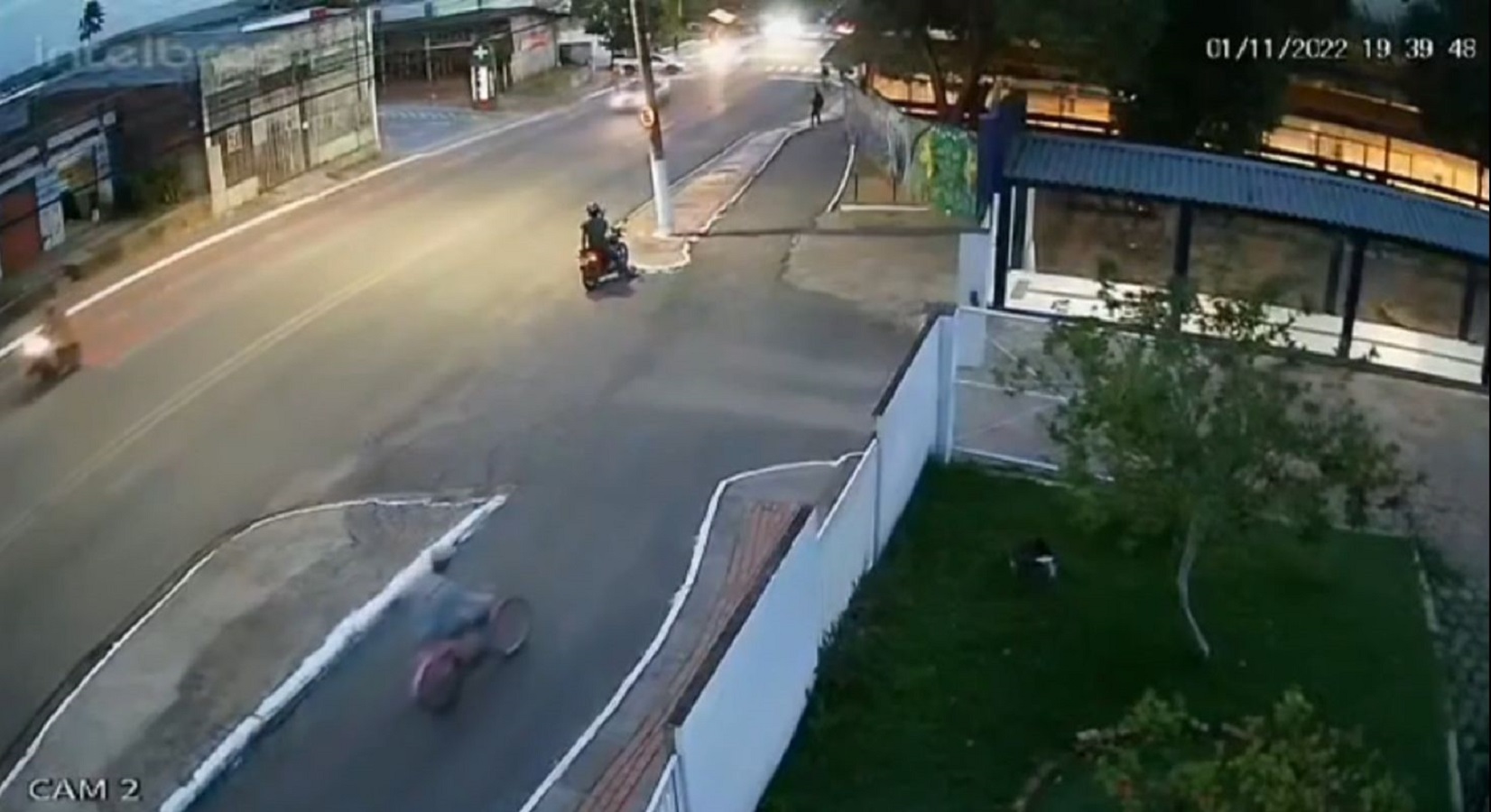 No vídeo, é possível ver o estudante na tentativa de atravessar a rua, quando foi atropelado por um motocicleta e, em seguida, atropelado por um carro.
