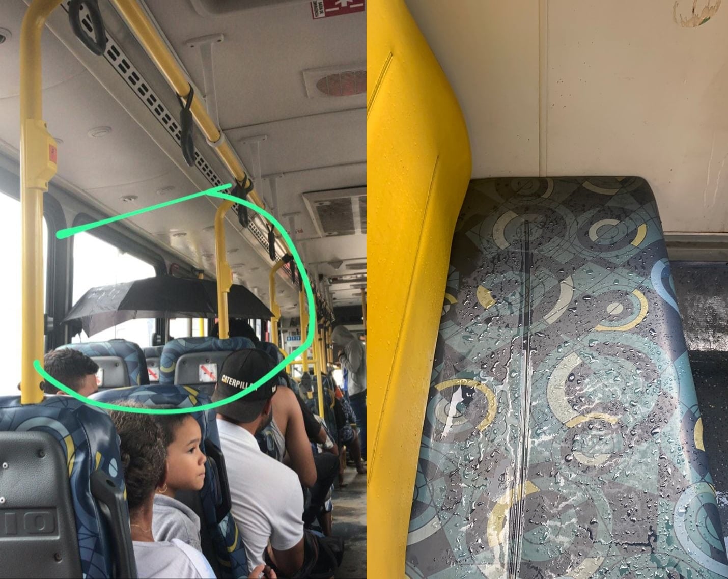 Nas imagens enviadas por usuários, é possível ver um passageiro que resolveu abrir um guarda-chuva dentro do ônibus para se proteger da água.