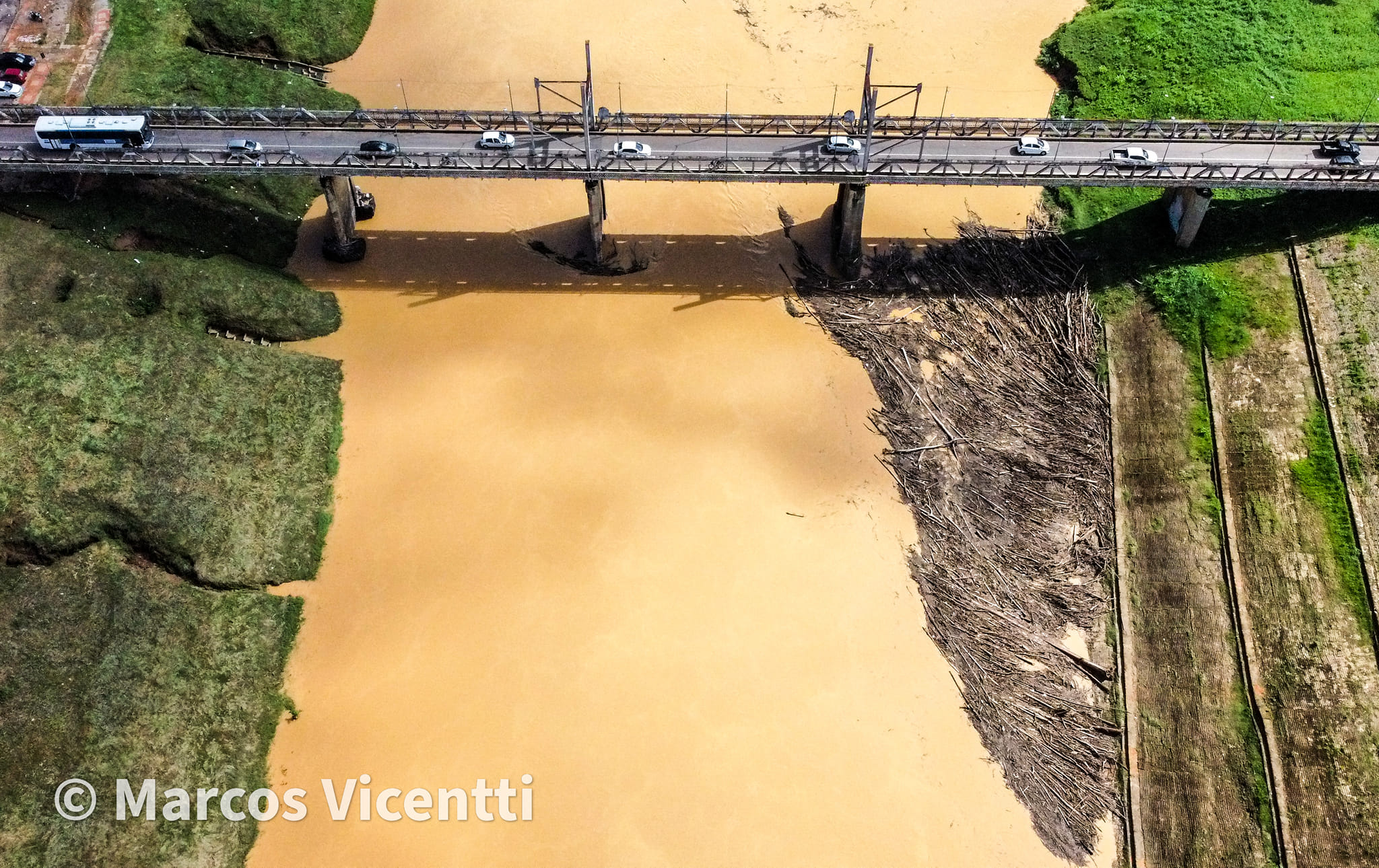 Os balseiros já estão acumulados nas colunas da ponte/Foto: Marcos Vicentti