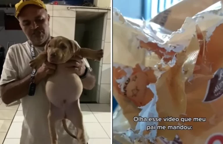 Cão ‘rouba’ saco de comida e tutor encontra pet em situação hilária