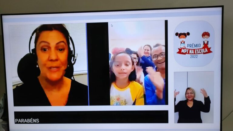 Luiara e equipe da escola Raimundo Magalhães recebendo prêmio em Live do MPT. Foto: Reprodução