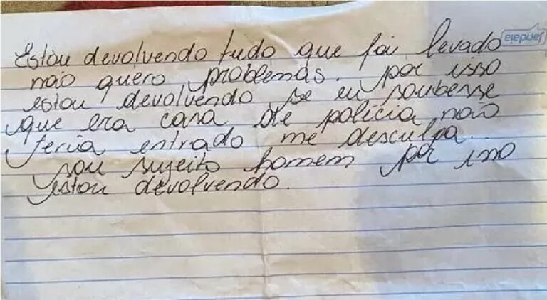 Após descobrir que a casa era de um delegado, os ladrões devolveram os pertences, e um deles escreveu um bilhete para a autoridade policial. “Estou devolvendo tudo que foi levado. Não quero problemas. Por isso, estou devolvendo. Se eu soubesse que era casa de polícia, não teria entrado. Me desculpa. Sou sujeito homem, por isso estou devolvendo”, dizia a mensagem.