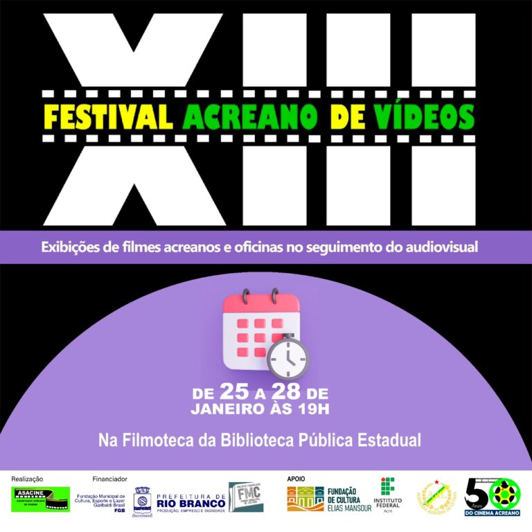 A Associação Acreana de Cinema (ASACINE), promove a partir dos dias 25, 26, 27 e 28 de janeiro, às 19h, na Filmoteca da Biblioteca Pública Estadual, o XIII Festival Acreano de Vídeos edição 2023.
