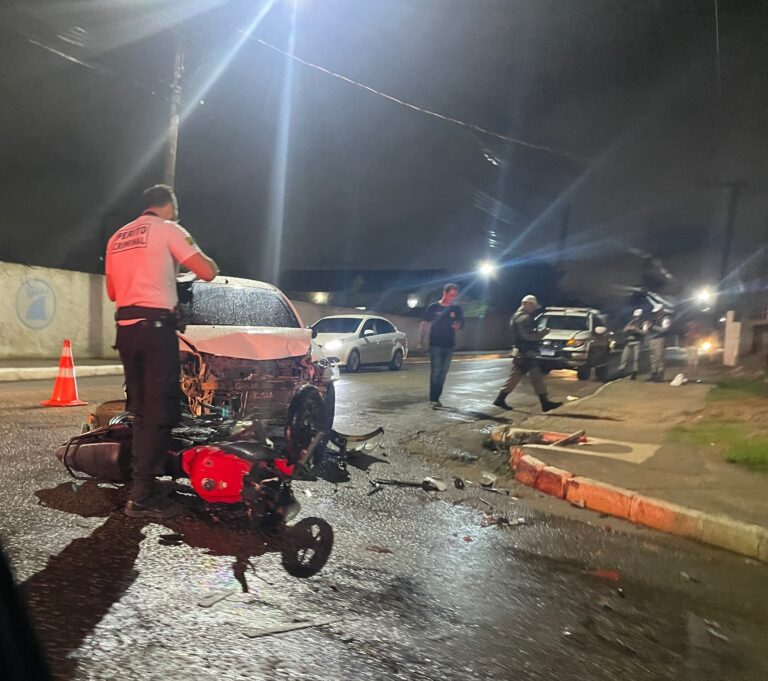 A batida foi registrada entre um carro modelo Citroen e uma motocicleta. Veja imagens tiradas na hora do acidente: