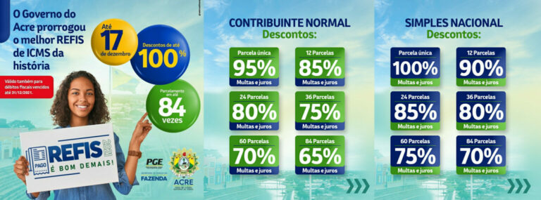 O governo do Estado do Acre autorizou a reabertura do prazo de renegociação de dívida por meio do Programa de Recuperação Fiscal (Refis). Os descontos podem chegar a 100%. A medida foi anunciada em decreto publicado na edição do Diário Oficial do Estado (DOE) deste sábado, 14.