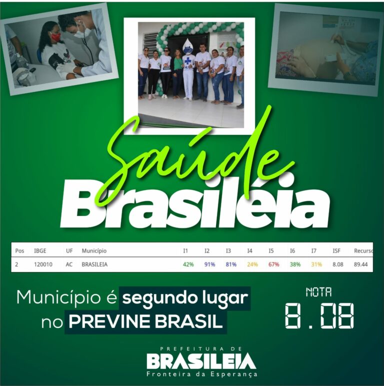 O municĂpio de BrasilĂ©ia tem um excelente motivo para comemorar os avanços nos indicadores de saĂșde: O Programa âPrevine Brasilâ colocou a saĂșde municipal em segundo lugar do Estado do Acre, perdendo apenas para Manoel Urbano.