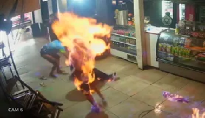 O fogo se alastra rapidamente, cobrindo em segundos todo o corpo de Juniele, além dos pés de Bruna, que chega a retirar a calça. O registro é interrompido neste momento.