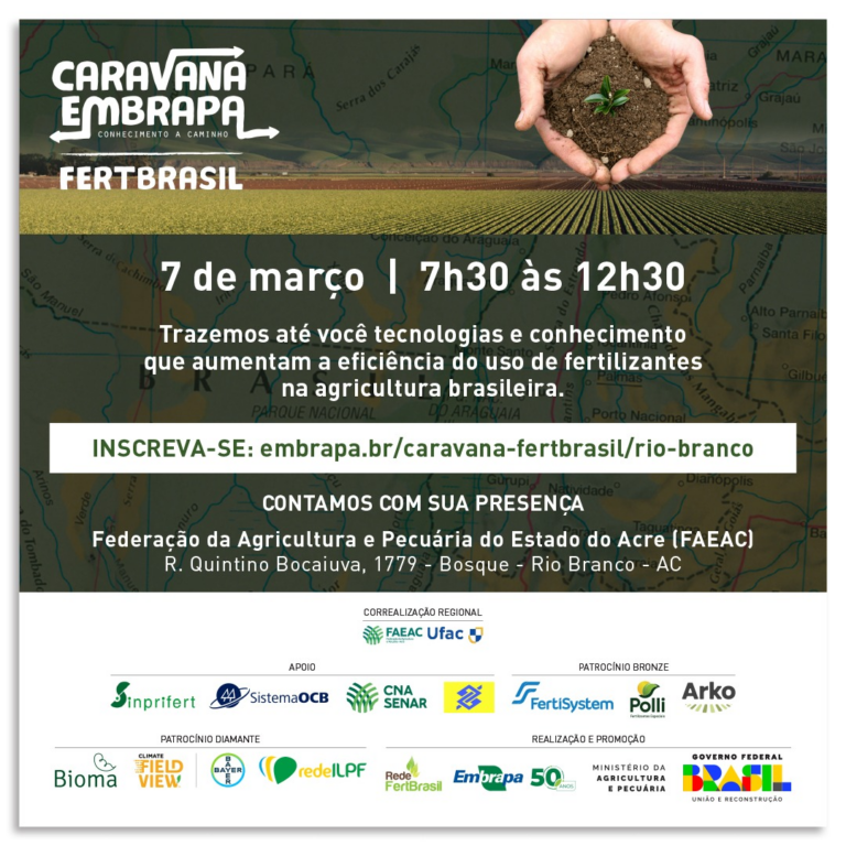 A Caravana da Empresa Brasileira de Pesquisa Agropecuária (Embrapa) Fert Brasil, que irá percorrer as principais regiões agrícolas do País, levando ao produtor rural tecnologias e conhecimento para aumentar a eficiência do uso de fertilizantes, enfatizar a importância do manejo sustentável dos solos e melhorar a produtividade, tem primeira parada na capital do Acre em 2023.