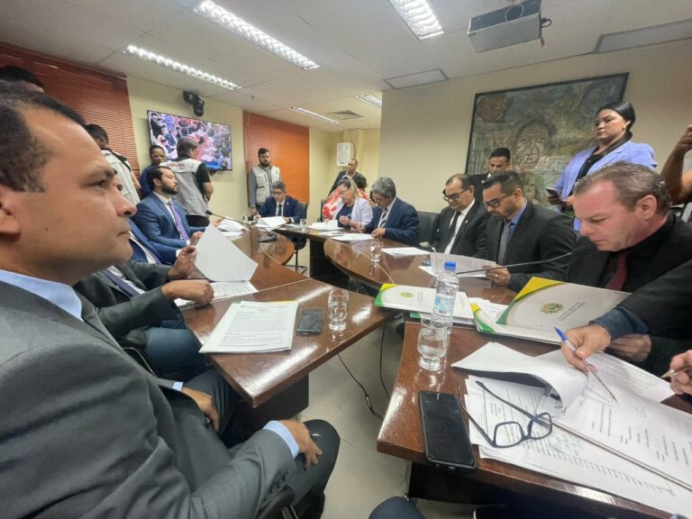 Na mesa, está o presidente da CCJ, Manoel Moraes, membros da comissão e a líder do governo, Michelle Melo. Além dos parlamentares: Emerson Jarude, Fagner Calegário, Edvaldo Magalhães, Pedro Longo, Gilberto Lira, Arlenilson Cunha, Tadeu Hassem e Tanizio Sá.