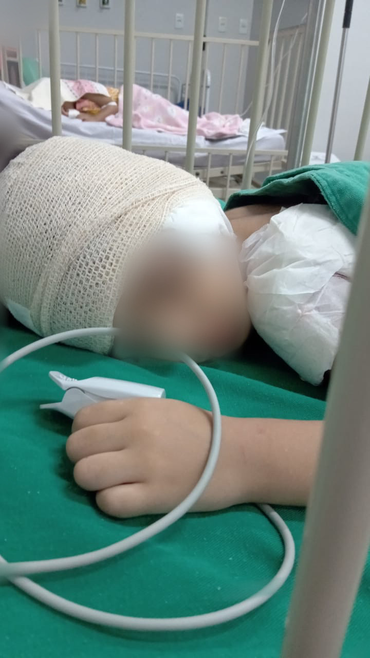 A criança chegou ao PS desfalecida e em estado grave. Foi necessária uma cirurgia de emergência e reconstrução da sua orelha, além disso uma artéria próxima a jugular foi atingida e a criança está sendo acompanhada por um otorrino no INTO-AC, no Hospital da Criança.
