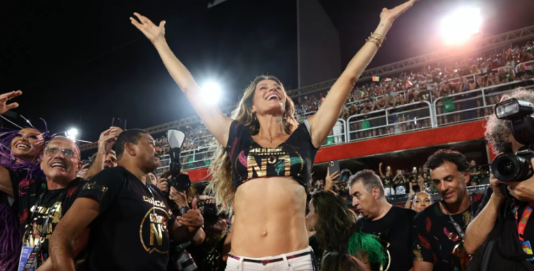 Gisele Bündchen não desfilou em nenhuma escola de samba do Rio, mas sua presença milionária em um camarote para uma ação de uma marca de cerveja marcou a primeira noite do grupo especial na Marquês de Sapucaí.