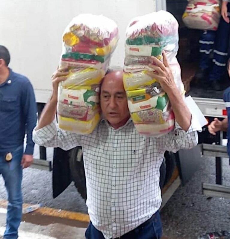 O prefeito Tião Bocalom mostrou estar em forma ao carregar em seus ombros dois sacolões que pesam aproximadamente 30 quilos. A turma que acompanha o prefeito durante as andanças pelos abrigos da prefeitura de Rio Branco, aplaudiu a façanha.