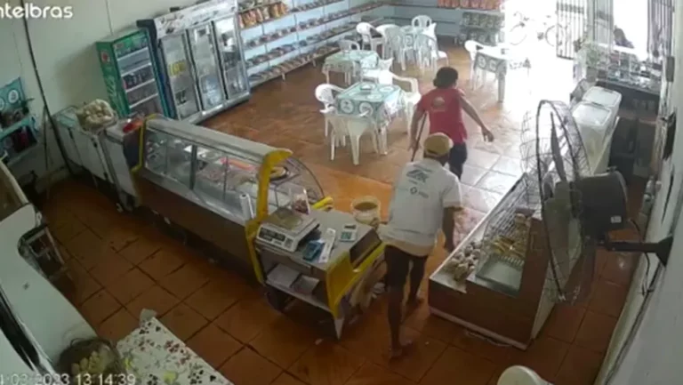 O vídeo mostra ainda que outra mulher, que estava na porta da padaria junto com uma criança, é abordada e agredida pelo homem.