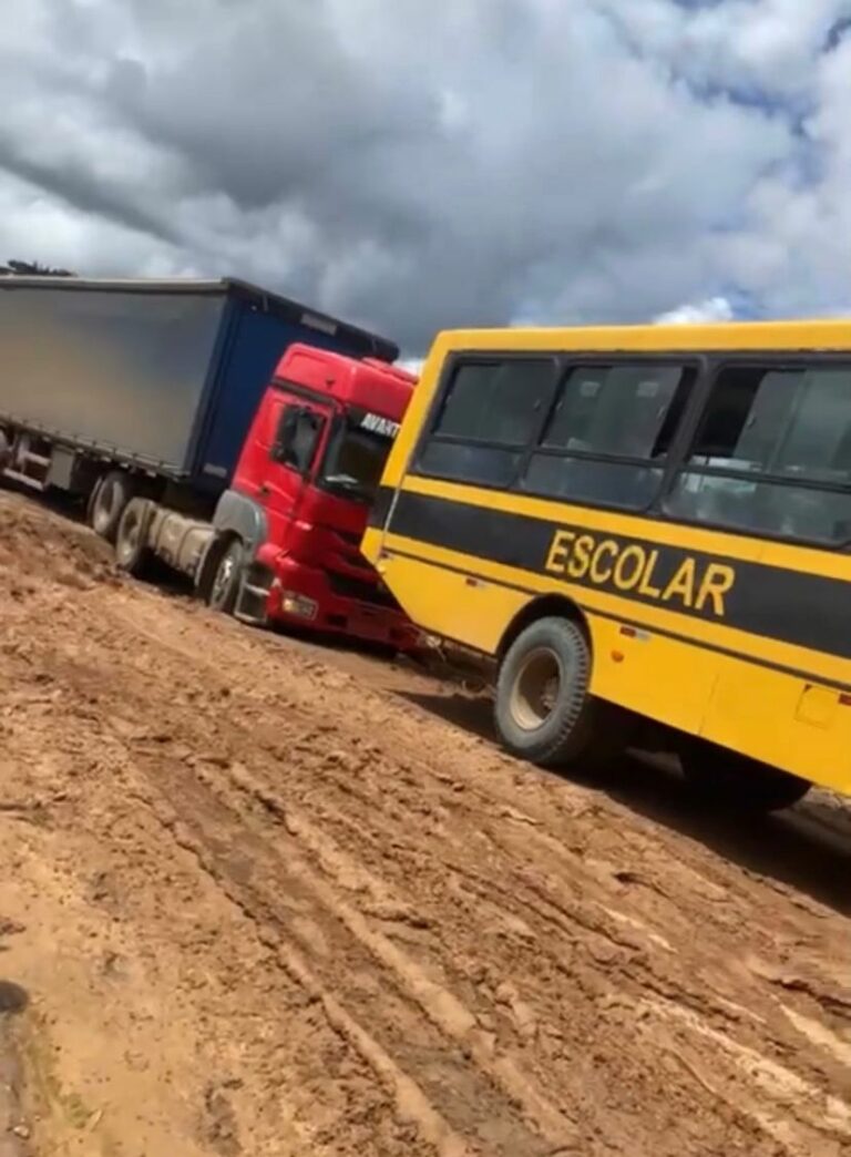 Um vídeo mostra uma carreta sendo puxada por um ônibus escolar, nesta quinta-feira (27), após atolar em um trecho da BR-364.