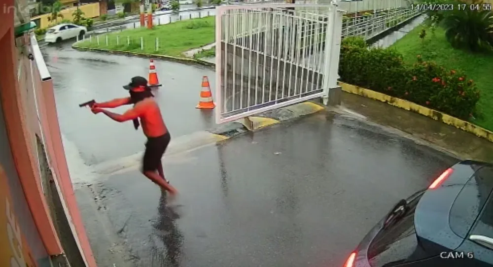 Os criminosos invadiram o condomínio por volta das 17h, em um carro preto. Logo que passam pelo portão principal, um deles já desce do carro atirando contra a guarita de vigilância.