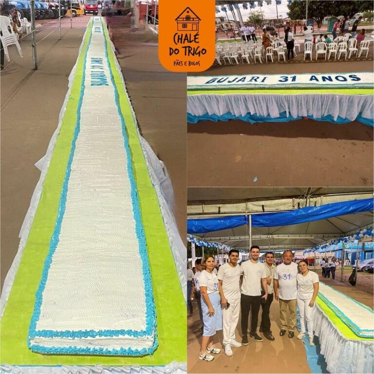 Na última sexta-feira (28) o município de Bujari comemorou seu 31º aniversário de emancipação com um bolo de 31 metros. O bolo gigante foi feito pelo Chalé do Trigo, que divulgou as imagens em suas redes sociais.