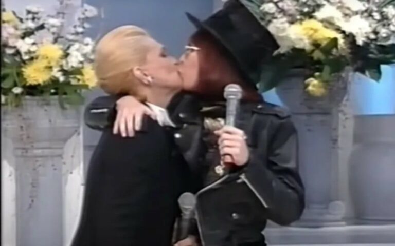 “Rita Lee, eu não sei o que falar para você. Eu te amo tanto. E, quando eu amo as pessoas, fico sem saber o que falar”, disse a loira. “Você já contou para os seus telespectadores? Não contou para o Lélio [Ravagnani, então marido de Hebe]. Eu contei para o Roberto [de Carvalho, marido de Rita]. Posso falar? Olha, é o seguinte. Eu vou me casar com Hebe Camargo. É verdade. Hebe, você não contou?”, falou a ruiva.