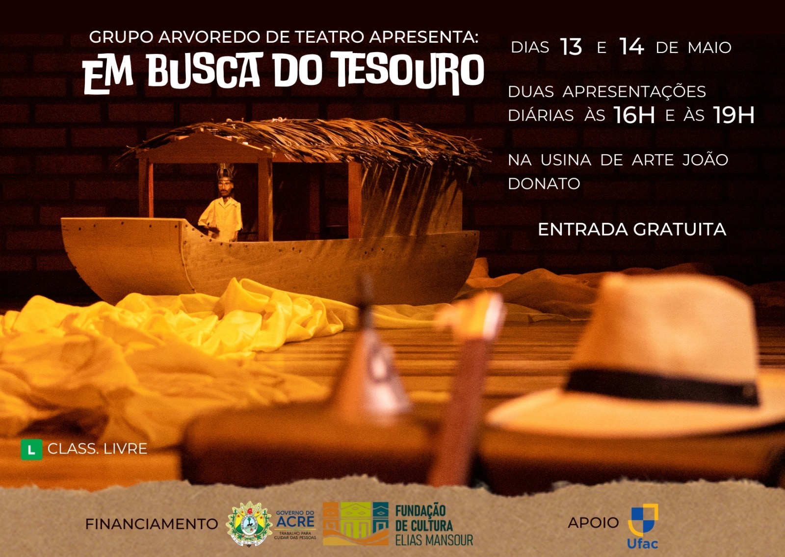 Nos dias 13 e 14 de maio, em duas sessões realizadas às 16h e às 19h, a Usina de Arte João Donato receberá o espetáculo “Em busca do tesouro”. A peça, encenada pelo Grupo Arvoredo de Teatro e financiada pela Fundação de Cultura e Comunicação Elias Mansour, é resultado de um processo desenvolvido após uma vasta pesquisa histórica sobre o povoamento da Amazônia, como foco na vinda de nordestinos para os seringais, especialmente durante a Segunda Guerra Mundial, ao longo da qual vieram mais de 50 mil homens para trabalhar na extração do látex.