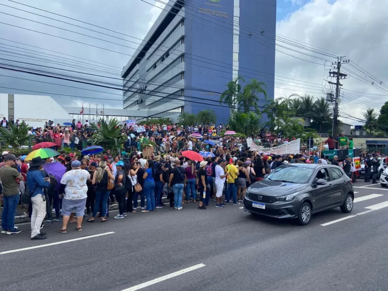 O protesto ocorre em frente à Assembleia Legislativa do Amazonas (Aleam), na Avenida Mário Ypiranga, Zona Centro-Sul. Parte dos professores também entrou na Casa legislativa e se concentra dentro do plenário.