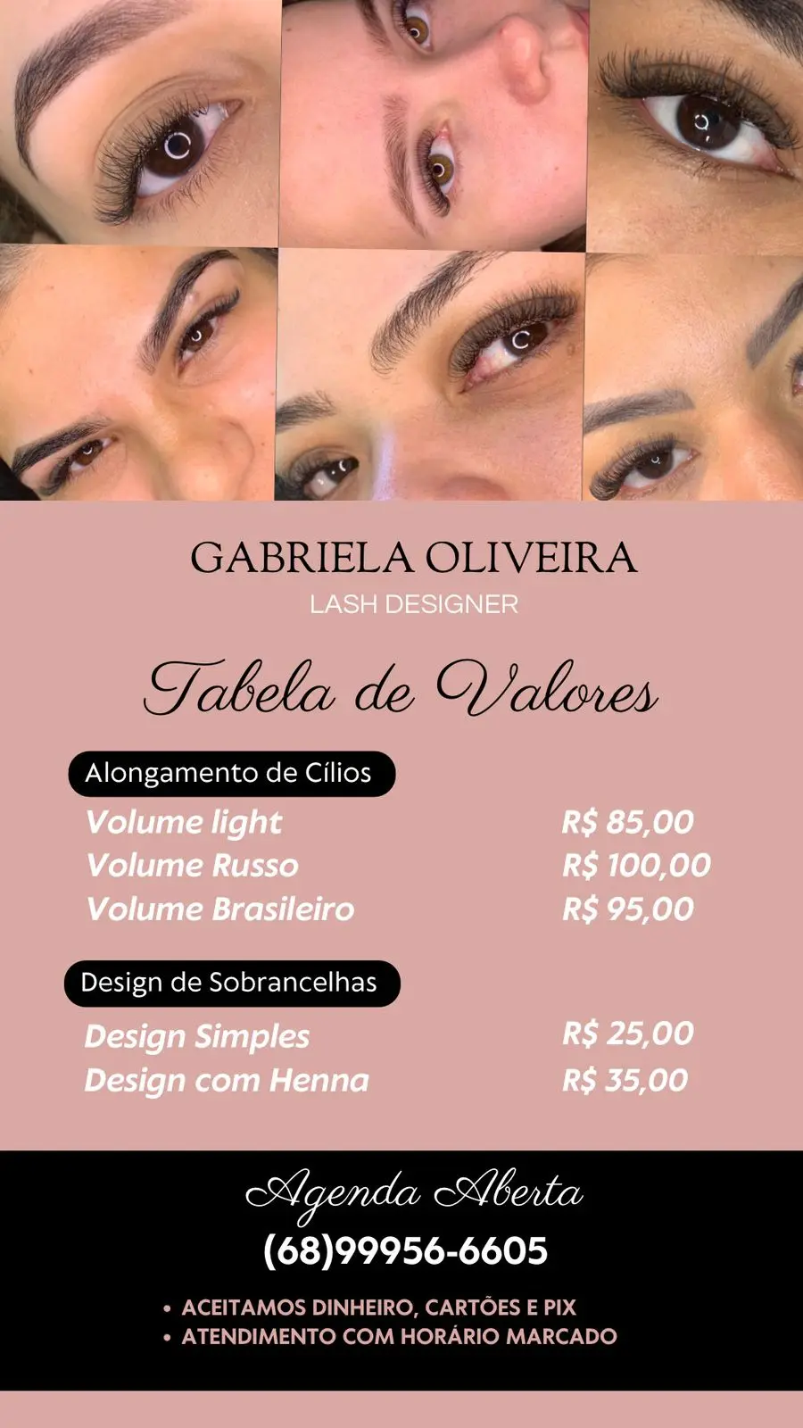 Há também, os serviços de design de sobrancelha, com valores de R$ 25 para design simples e R$ 35 para designer com henna.