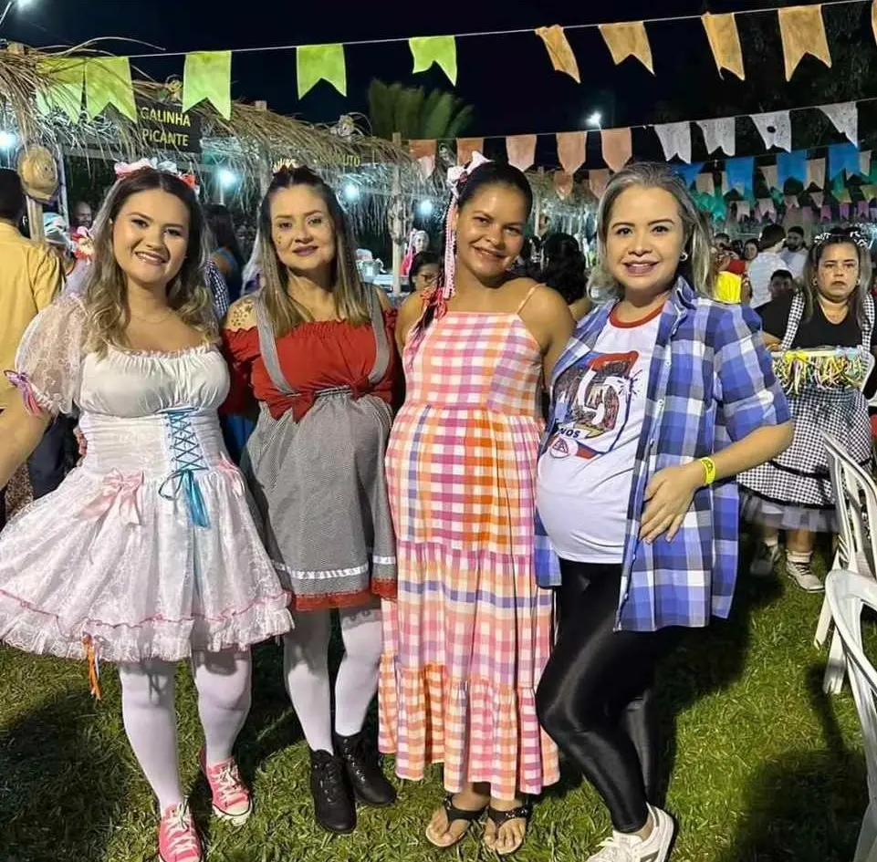 A coordenadora do Meta Kids Priscila Couto Reis gravidíssima e animadíssima com parte de sua equipe no tradicional Arraial do Colégio Meta realizado nos dias 1 e 2 de julho.