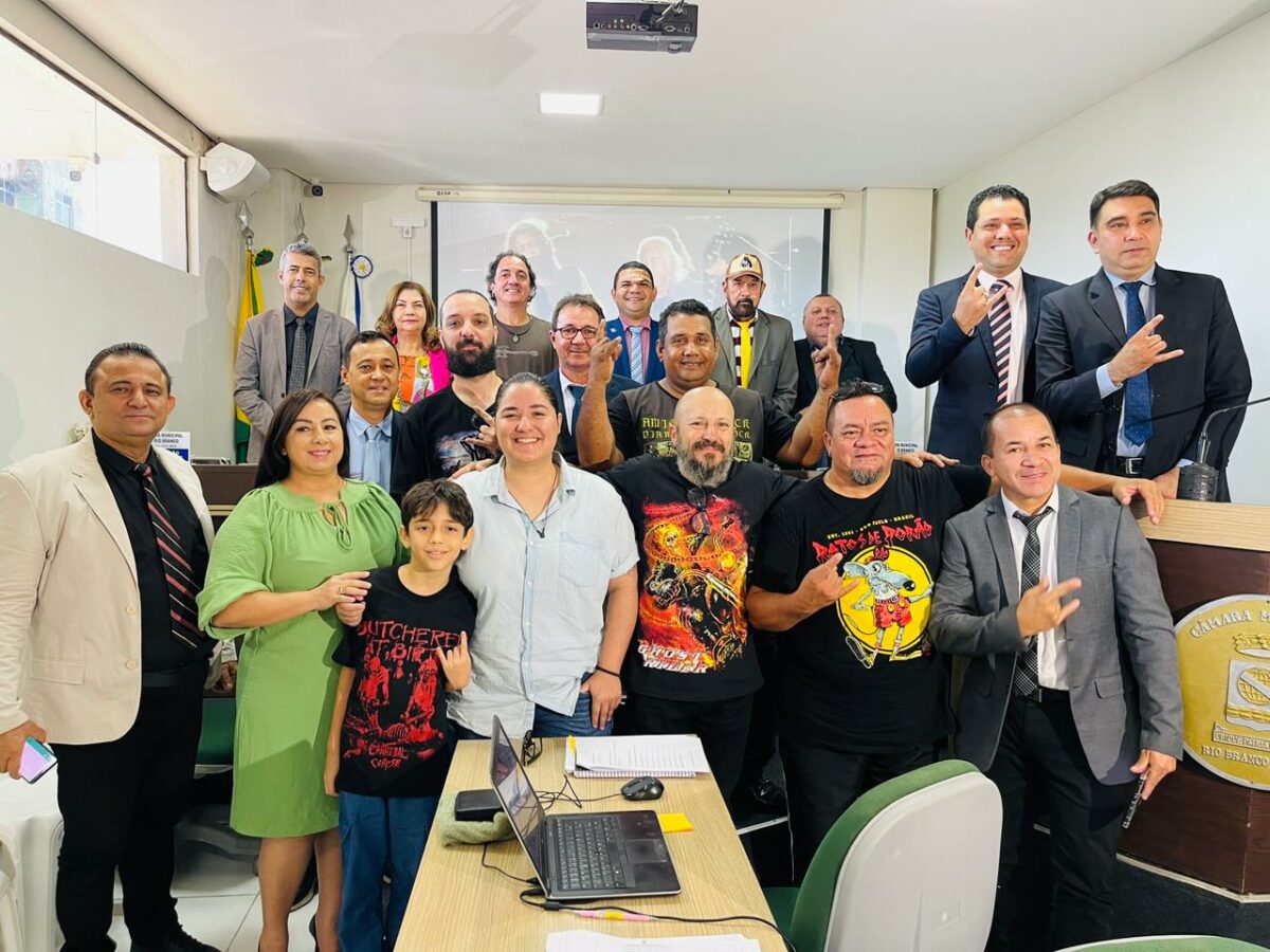 Vereadores da Câmara de Rio Branco receberam músicos e produtores na Tribuna Popular realizada nesta quinta-feira, 13, Dia Mundial do Rock. O músico, empresário e produtor Igor Healer, acompanhado do mulfifacetado artista Álamo Kário e da cantora Bel Cordeiro, falaram sobre os desafios que envolvem o estilo musical.