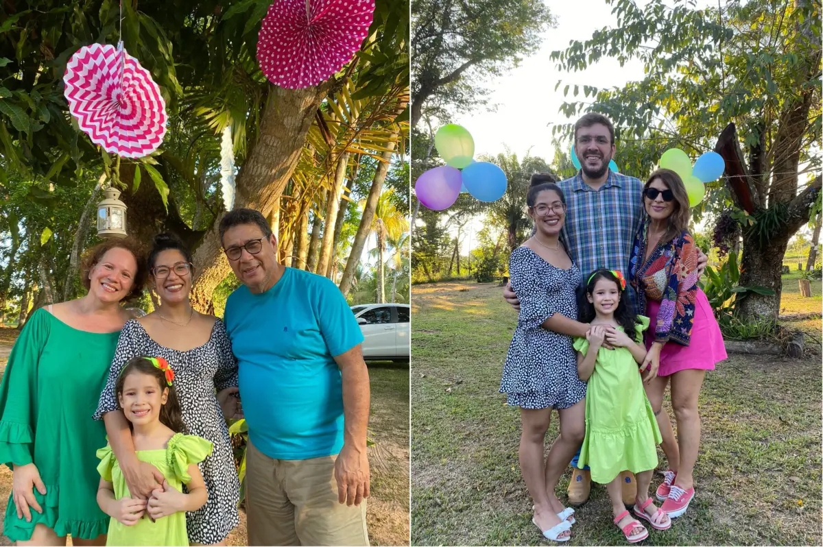 À esquerda, a aniversariante com a mãe e o casal Mara Salomão e Jairon Nascimento. À direita, Cecília, Raíssa e seu noivo Paulo Pinheiro (meu filho) comigo