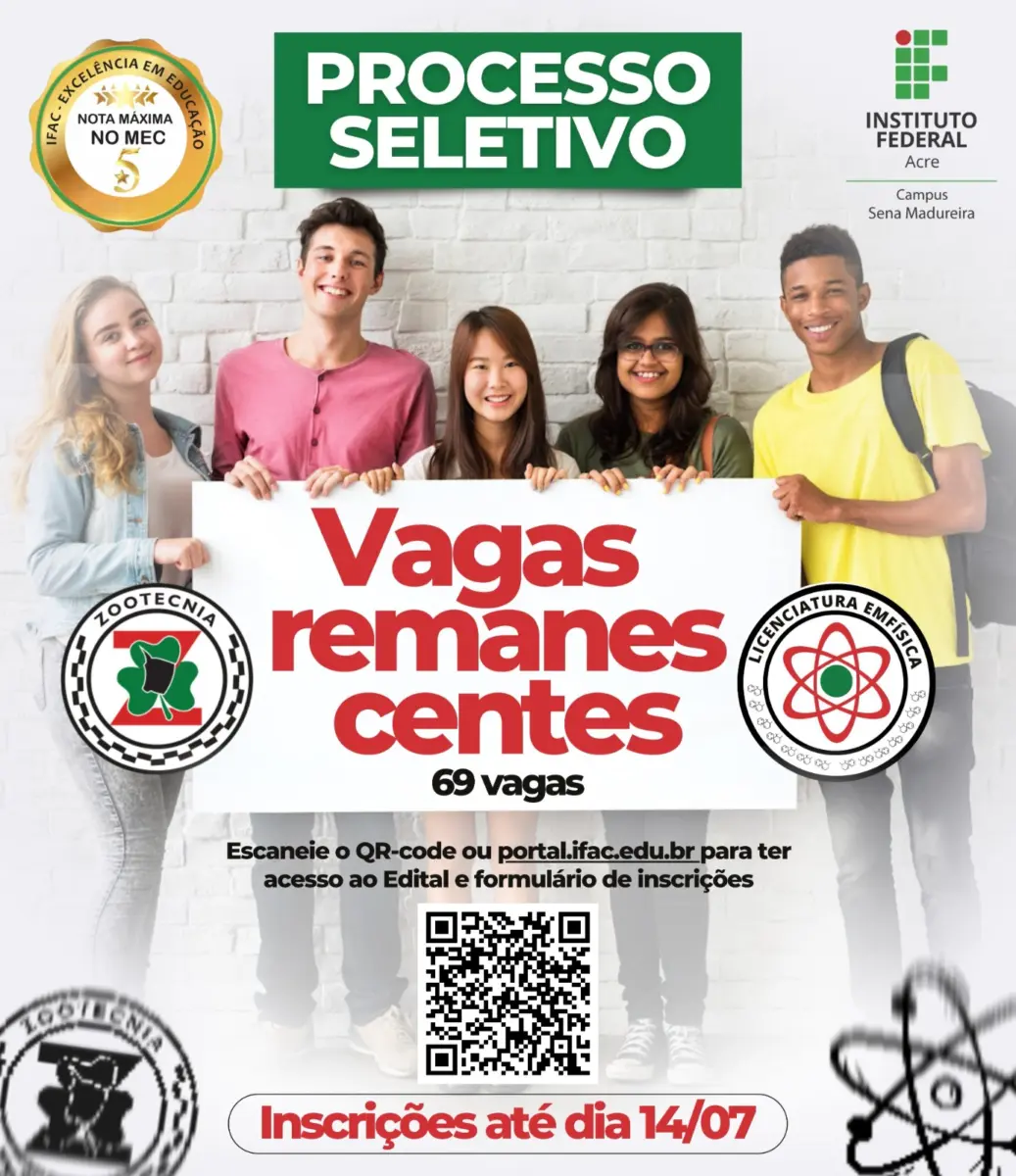 Estão abertas as inscrições do Processo Seletivo para vagas remanescentes nos cursos de graduação de Bacharelado em Zootecnia, do Campus Sena Madureira/IFAC, que se estenderá até o dia 14 de julho, exclusivamente, para os