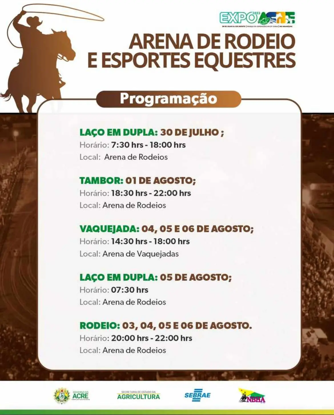 Algumas das atrações da Expoacre são o rodeio em touros e os esportes equestres, que neste ano já têm início no dia 30 de julho, com o laço em dupla. O governo do Estado divulgou a programação completa das modalidades, nesta sexta-feira (28).