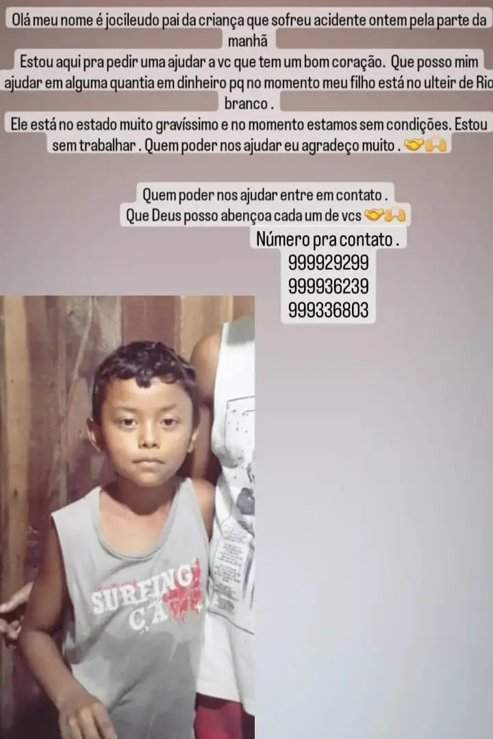 Sem dispor de condições financeiras, a família pede ajuda à população para arcar com as despesas, visto que, seu pai – o provedor da casa, está acompanhando o mesmo e não tem como trabalhar. Quem puder ajudar a família, a chave pix é a seguinte: (68) 99992-9299.