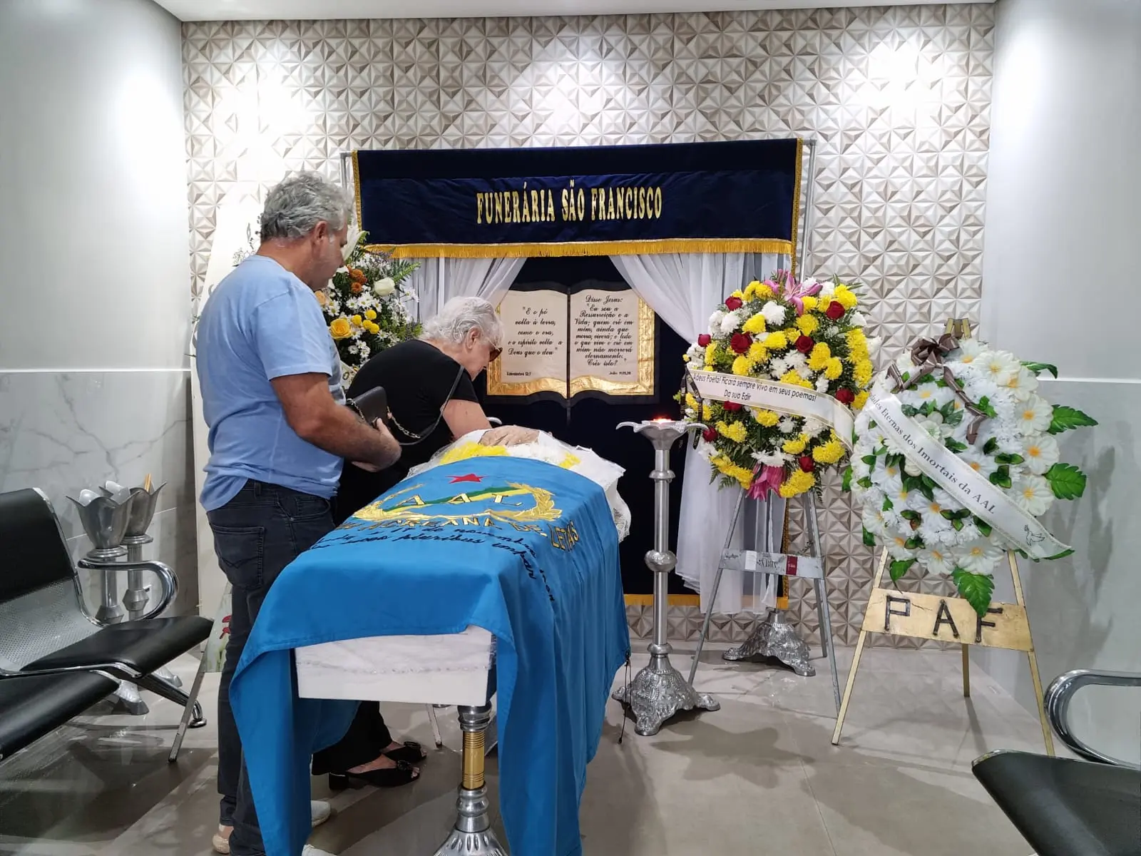 A professora Edir Marques soube da morte do marido, o poeta acreano Mauro Modesto, quando estava fora do estado, em uma viagem a passeio. Na manhã desta sexta-feira (14), a viúva chegou à Capela São Francisco, no bairro Bosque, onde ocorre o velório.