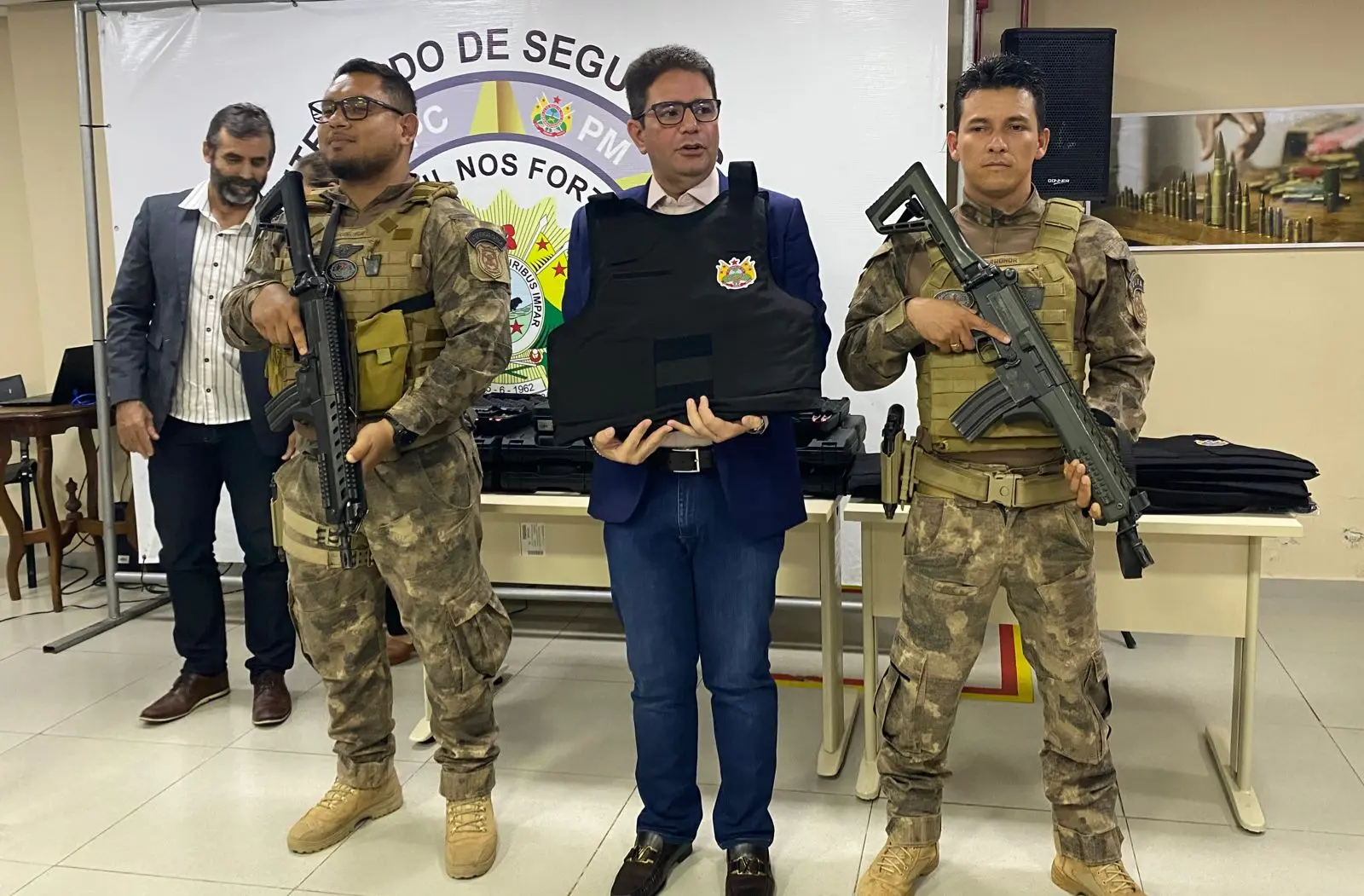 O governo do Acre, por meio da Secretaria se Segurança Pública (Sejusp), realizou na manhã desta terça-feira (18) a entrega de coletes balísticos e pistolas para as polícias Militar e Civil.