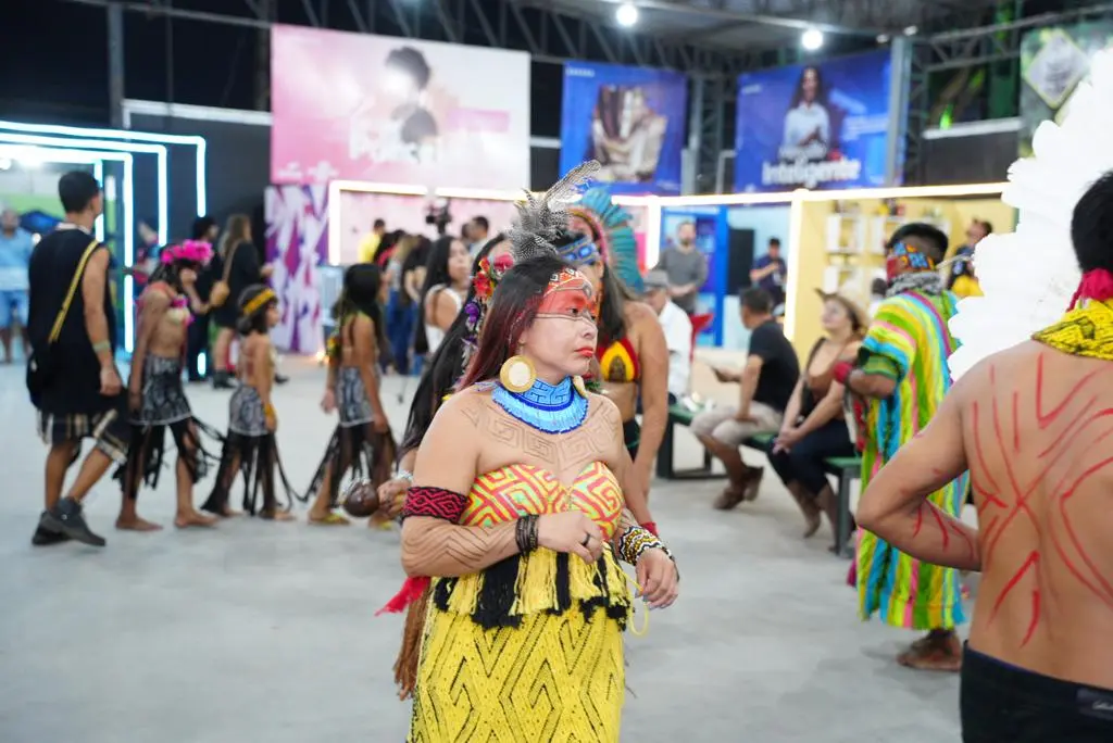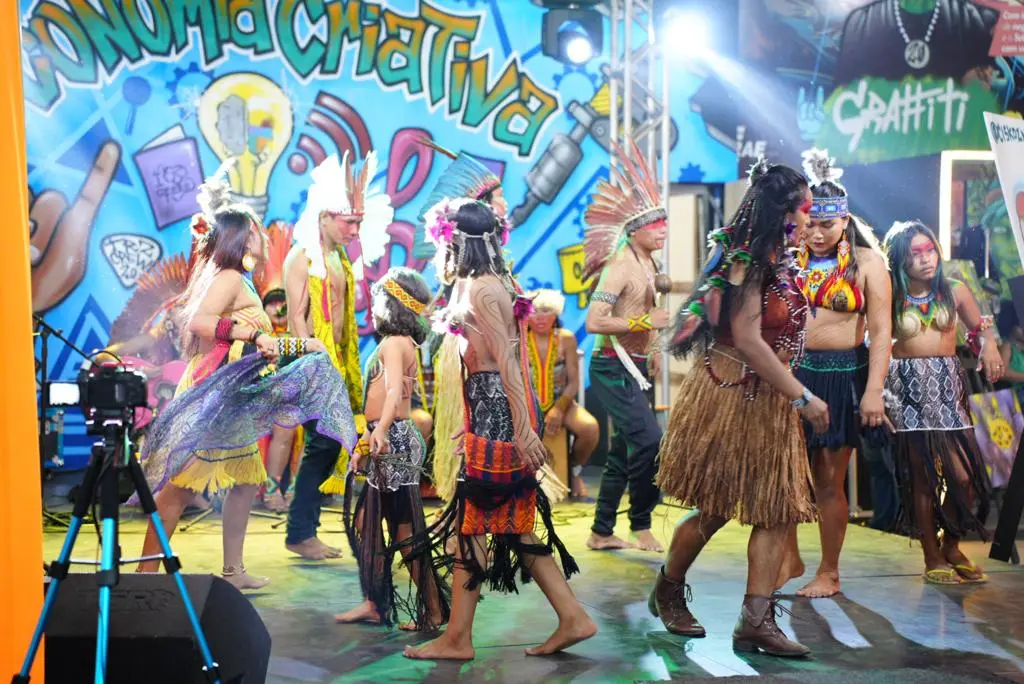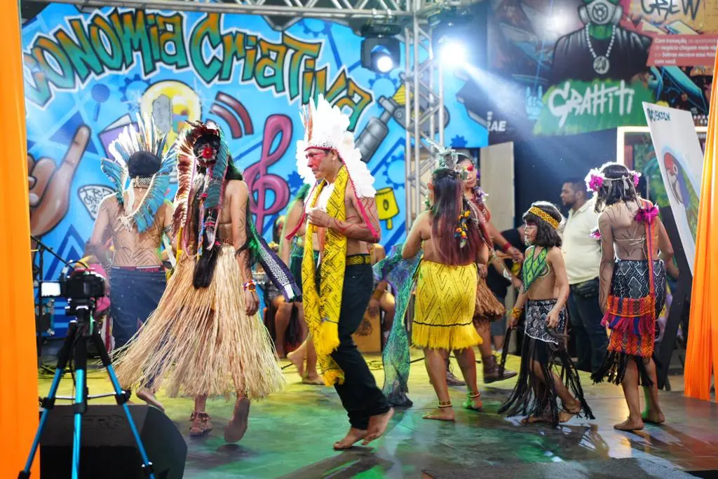 Os indígenas das etnias Huni Kuin e Shanenawa fizeram apresentações no palco do galpão Sebrae na Expoacre 2023. Os indígenas participaram com músicas, rituais e danças de cura.