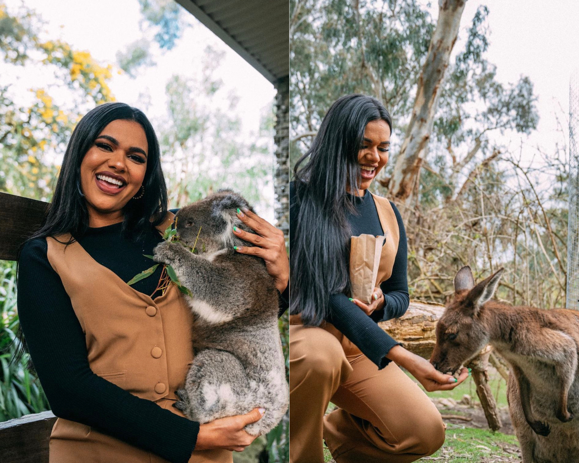 Já nesta quarta-feira (25), Jéssica publicou imagens conhecendo dois dos maiores símbolos da Austrália: o coala e o canguru. “Ainda tenho tantos registros para compartilhar com vocês”, disse.