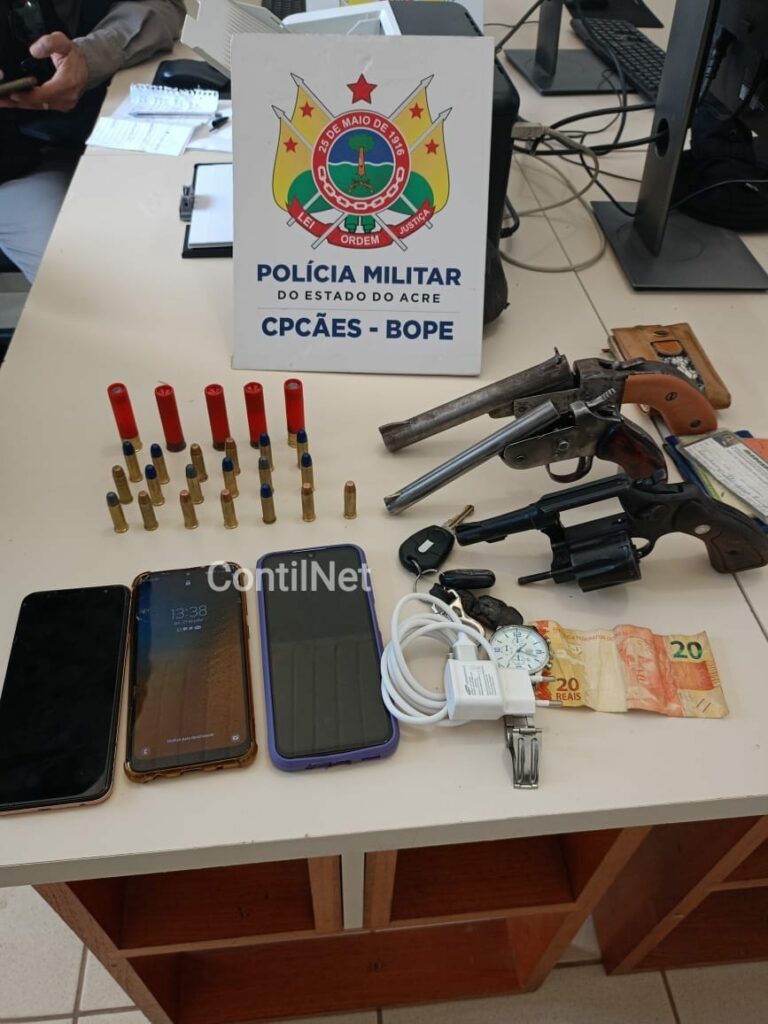 policia 5Os policiais militares do CPCães, que é uma companhia do Bope, estava mais próximo e atendeu a ocorrência. Foi feita a aproximação e a abordagem do veículo, e durante a revista pessoal foram encontrados na carro três armas de fogo sendo, um resolver calibre 38 com 19 munições intactas e duas armas de fabricação canseira calibre 28, com cinco cartuchos intactas.