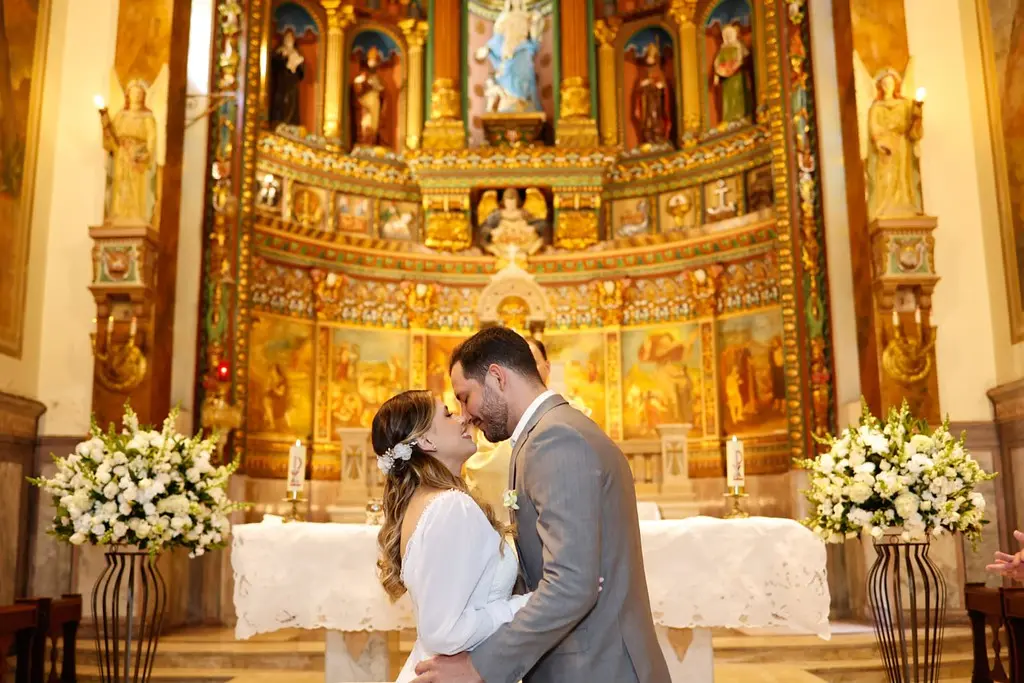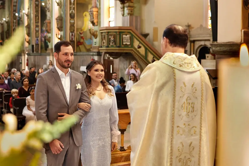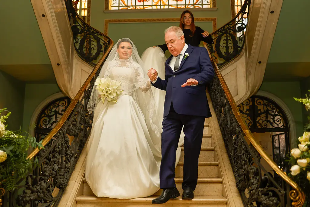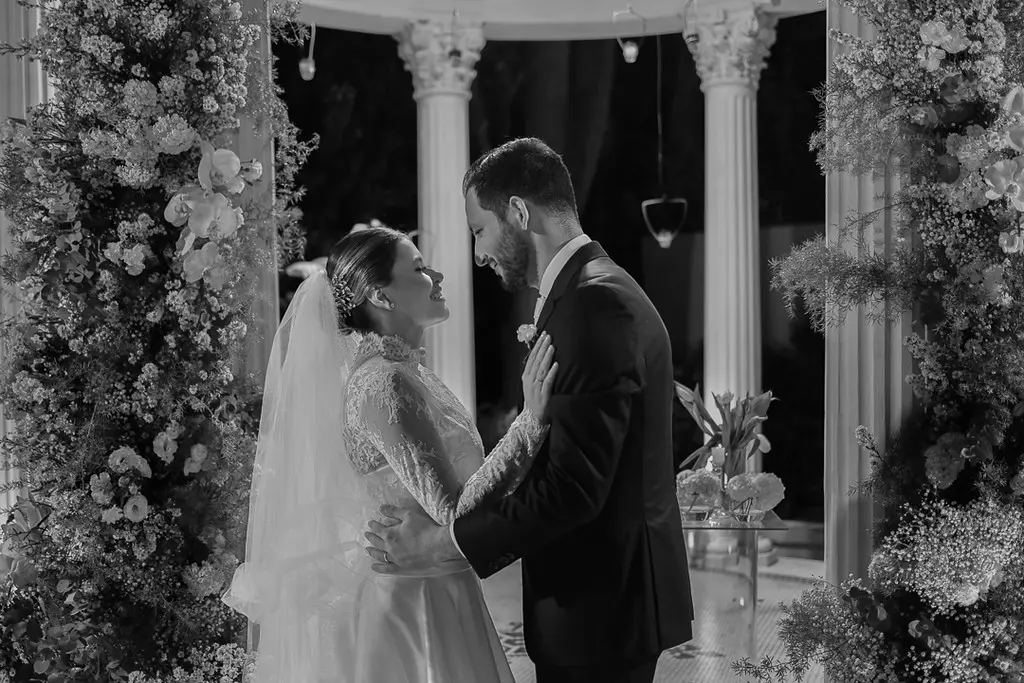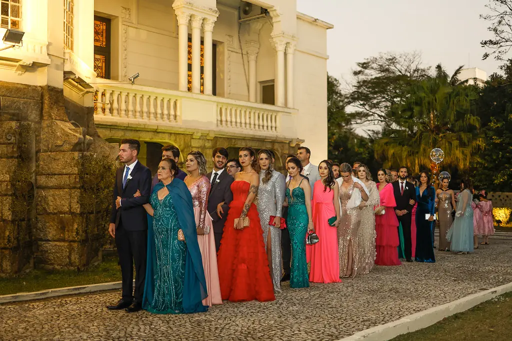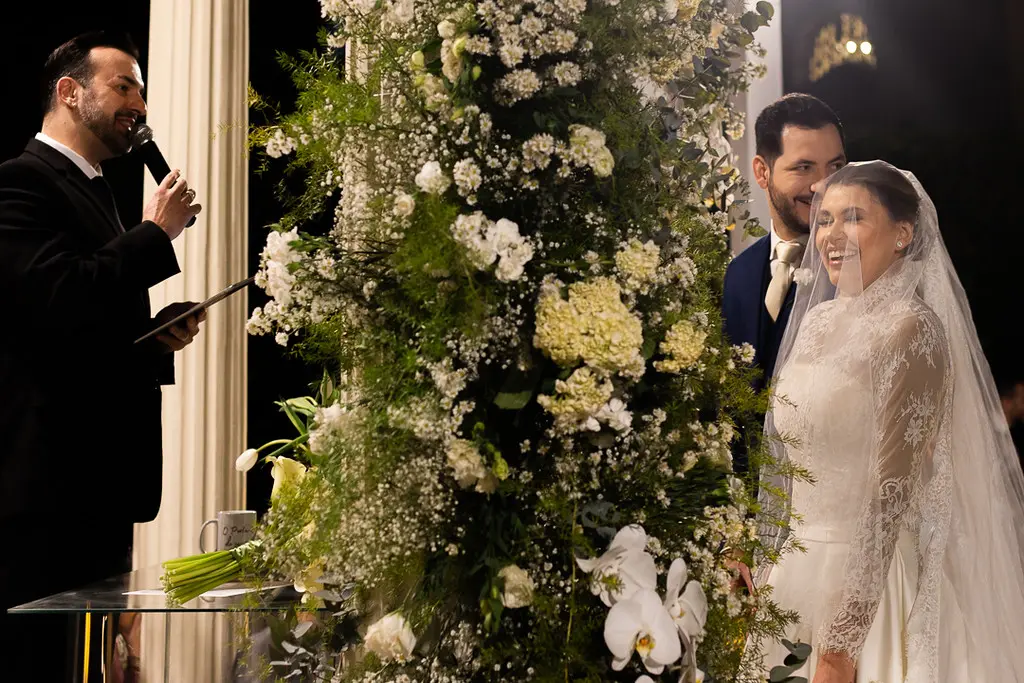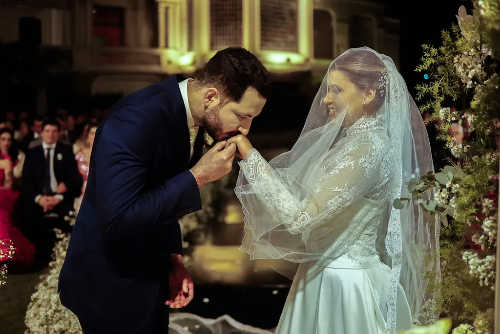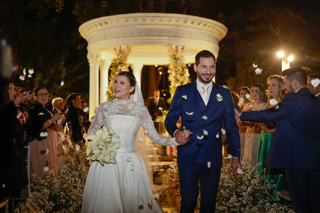 MARAVILHOSO! Esta foi a opinião unânime dos que se fizeram presentes no enlace matrimonial dos médicos Mariana Chaves Penteado e Bruno Gemilaki no dia 15/07 em São Paulo. O evento ocorreu no belíssimo espaço do Palácio dos Cedros. A cerimônia foi realizada ao pôr do sol no jardim do palácio, onde há uma réplica do “templo do amor” do Palácio de Versailles da França. Todos se emocionaram com a entrada da noiva ao som da marcha nupcial de Mendelson interpretada pela orquestra Volksmusik, presente durante todo o evento.