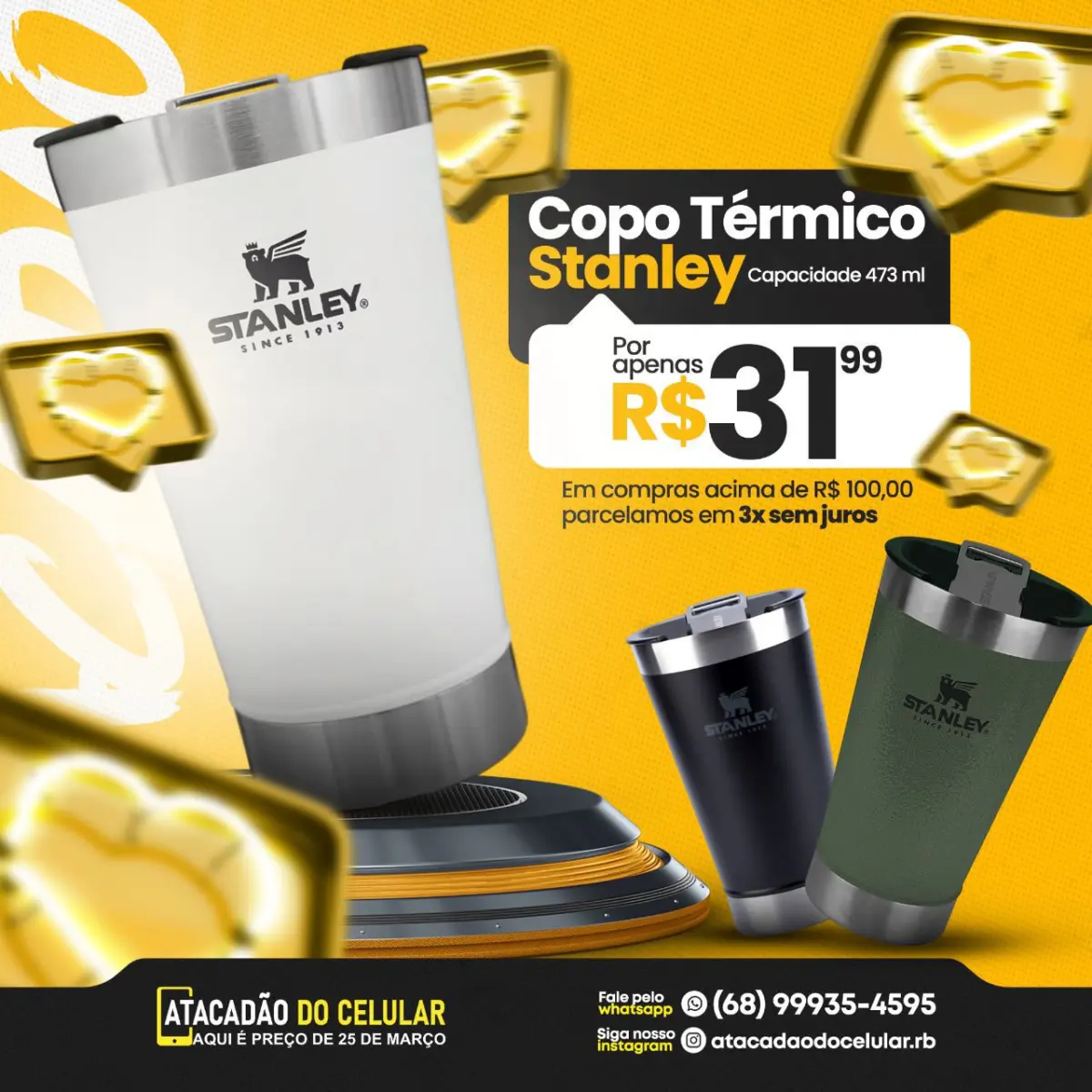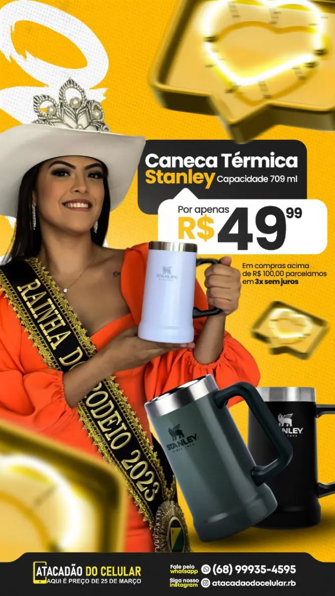 Faltando poucos dias para a Expoacre, a loja Atacadão do Celular lançou uma promoção de canecas térmicas Stanley, de capacidade de 709 ml, pelo valor de R$ 49,99, e os copos no valor de R$ 31,99 para as 9 noites da feira agropecuária.