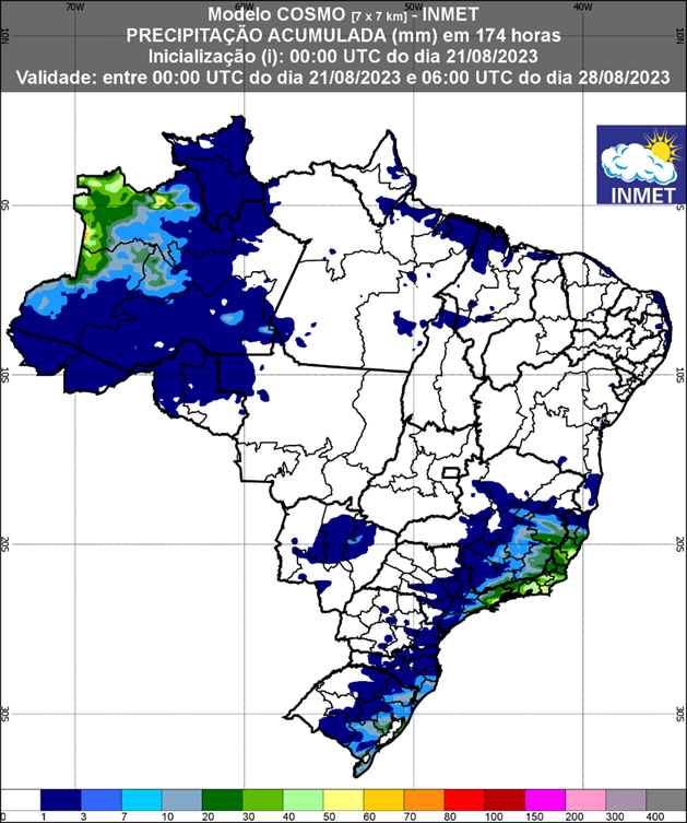 Previsão de chuva para 1ª semana (21/08/2023 a 28/08/2023). Fonte: INMET.