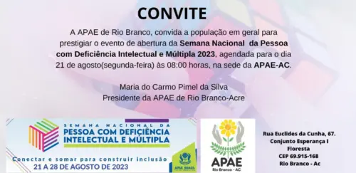 A Associação de Pais e Amigos dos Excepcionais (APAE) de Rio Branco está pronta para inaugurar a tão aguardada Semana Nacional da Pessoa com Deficiência Intelectual e Múltipla. O evento de abertura está marcado para a próxima segunda-feira, 21 de agosto, às 08h, e será realizado nas instalações da própria APAE-AC.