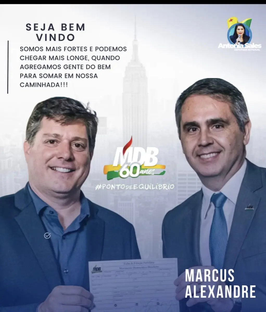 Ontem, terça-feira (08), aconteceu em Brasília a filiação do ex prefeito Marcus Alexandre ao MDB. Vários Mdbistas deram boas vindas ao novo filiado. Dentre os políticos, a deputada Antonia Sales, que enfatizou: “Somos mais fortes e podemos chegar mais longe, quando agregamos gente do bem para somar em nossa caminhada”.