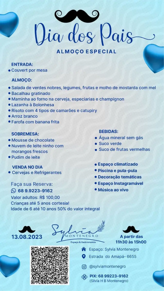 O Espaço Sylvia Montenegro prepara neste domingo (13) aquela festa de dia dos Pais especial. Corra para não deixar de presentear seu herói com um belo almoço.