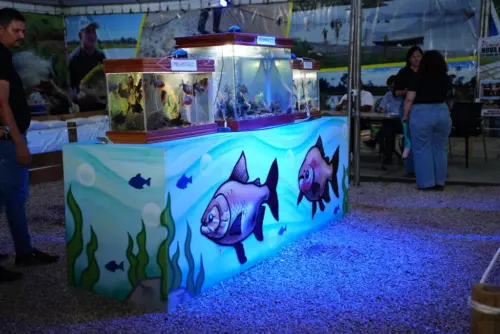 O Sebrae Acre, além do Galpão da instituição, também está presente em um espaço de piscicultura na Expoacre 2023, no Parque de Exposições Wildy Viana, no 2º distrito de Rio Branco (AC). Segundo Rina Soares, analista do Sebrae, o ambiente é destinado para a piscicultura e traz sete espécies de peixes.